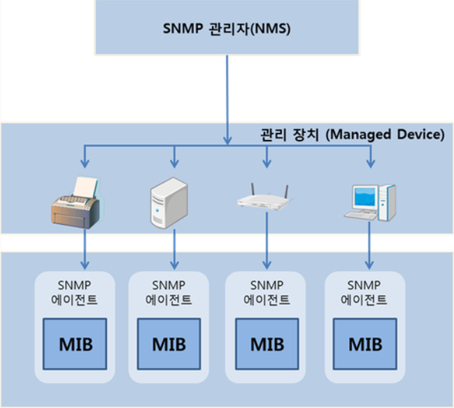 SNMP는 IP 네트워크에서 장치로부터 정기적으로 여러 정보를 자동으로 수집하여 네트워크를 관리하기 위한 프로토콜입니다. 네트워크를 관리하기위해 모니터링이나 환경설정 등의 운영을 할때 사용되며 UDP에 정의된 응용계층 프로토콜이므로 관리 정보를 얻기 위해 프로그램이 준비되어야 합니다.