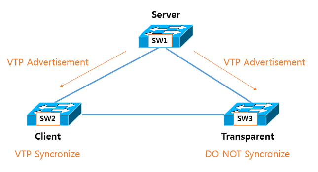 Transparent는 Summary Advertisement를 서버로부터 수신하더라도 자신의 VLAN 정보를 변경하지 않고 원상태를 유지하며, 자신의 VLAN 정보 또한 전송하지 않습니다.