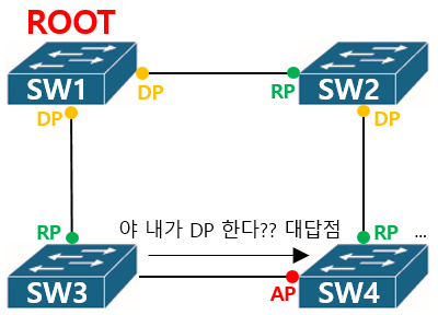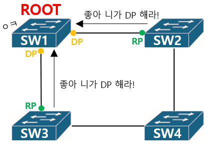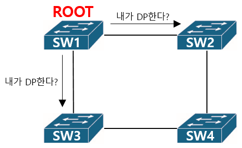 Root 선출기준은 동일합니다. SW1이 Root가 됩니다. 그러면 Root 스위치부터 자신이 DP라는 제안을 시작하고, 하위 노드는 루핑을 막기위해 Root의 BPDU를 확인하는동안 잠시 다른 포트를 BLK 시킵니다.
