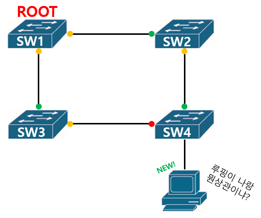 스위치는 모든 포트가 연결되면 LSN(15초) → LRN(15초) 상태를 거친 다음 FWD 상태가 됩니다. 하지만 이 그림에서 PC가 추가되더라도 End-Device 이므로 루프가 발생하지 않는 구간입니다. 포트패스트는 이러한 End-Device에 설정하면 LSN, LRN을 건너뛰고 바로 FWD 상태가 되어 30초의 Convergence Time을 단축시키는 방법입니다.