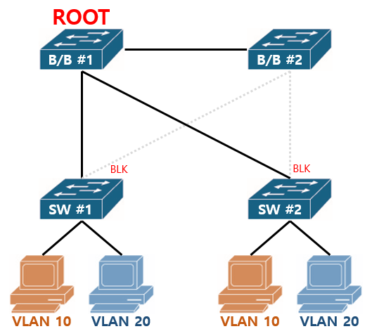 이러한 구성이 굉장히 흔한 구성이라고 말씀드렸었습니다. 이 구성에서 단일 STP가 돌아간다면 대충 오른쪽과 같은 구성이 될텐데, BLK 된 포트로는 BPDU 만 주고받고 데이터는 전달되지 않습니다. 따라서 하단의 PC가 통신한다고 가정했을 때 모든 트래픽이 B/B #1 로 집중됩니다.