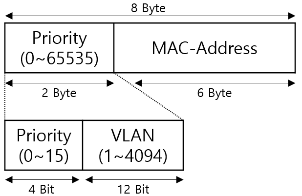 그래서 실질적인 우선순위는 4비트만을 사용하는데 VLAN을 나타내는 12비트가 뒤따라오기 때문에 4096을 기준으로 X2 하여 계산하여야 합니다. 즉, 기본값인 32768은 Priority 8을 나타내며 Priority와 VLAN을 더한것이 ID가 됩니다.