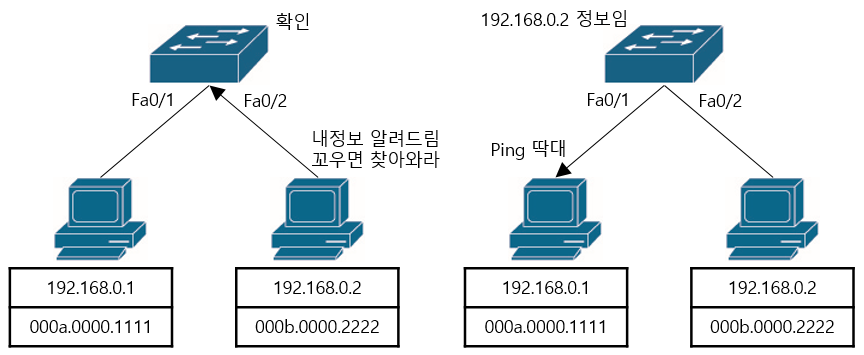 라우팅을 시작하기전에 먼저 스위치의 동작방법을 되짚어 보겠습니다. 스위치는 L2, 즉 MAC-Address를 보고 데이터를 전달하고, 우리는 IP를 사용하니까 MAC 주소를 알기위해 ARP를 사용하죠.