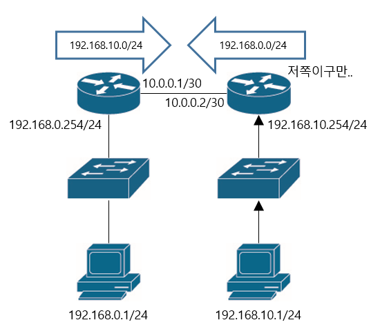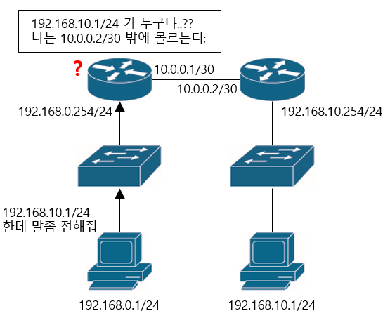 좌측의 라우터는 192.168.10.0/24 네트워크로 가는 길을 알지만, 우측의 라우터는 192.168.0.0/24 네트워크로 가는 길을 지정해주지 않았습니다. 이 경우 양방향 통신이 불가능합니다.