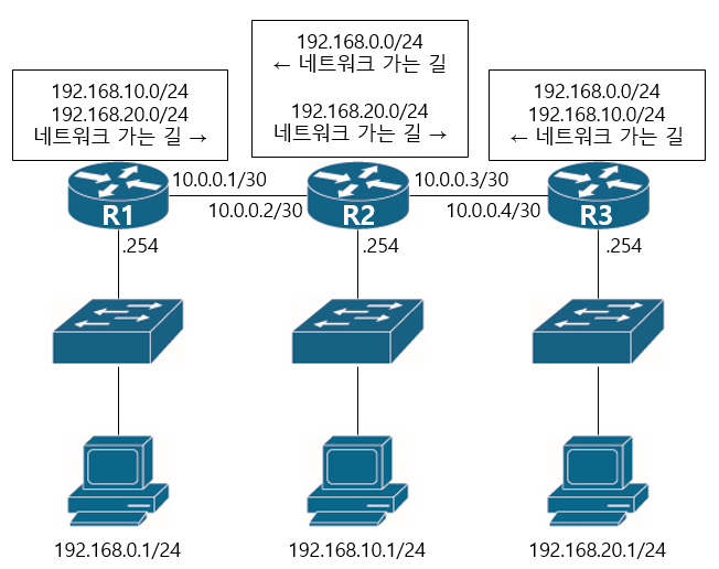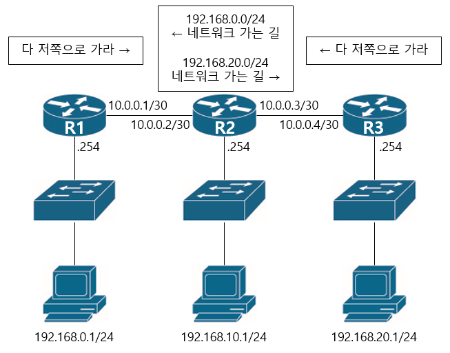 이러한 구성을 자세히 들여다보면 R1, R3는 어디와 통신하던 모든 트래픽을 R2 방향으로 전달해야만 하는 구조입니다. 따지자면 R1과 R3는 길이 하나밖에 없고, R2만 갈림길이 있는 도로입니다. 갈림길에서는 방향을 안내해줄 표지판이 필요하지만 길이 하나뿐이라면 굳이 표지판은 필요 없겠죠.