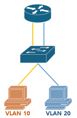 이러한 구성에서 VLAN 10, 20간 통신이 가능하려면 기본적으로 Switch에서 종단으로는 Access, 업링크는 Trunk, 라우터는 서브인터페이스 구성이 필요합니다.