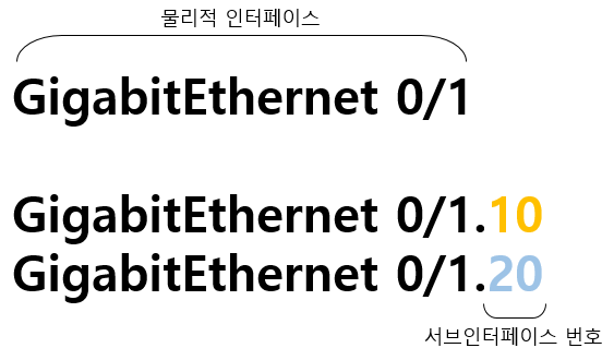스위치의 Trunk와 거의 비슷한 개념으로 말은 다르지만 별로 복잡할 것은 없습니다. 이런식으로 하나의 인터페이스 안에 있는 여러개의 논리적 인터페이스를 sub-interface 라고 하며 해당 인터페이스에서 (.) 을 찍어서 분리합니다.