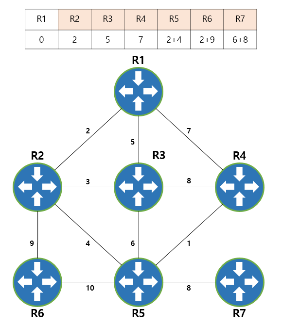 다음으로 가중치가 적은 R5를 방문하고, R7의 경로값을 갱신합니다. 이후 같은 과정을 반복하며 테이블에서 가중치가 적은 노드들을 차례로 모두 방문하게 되면 갱신이 끝나게 됩니다.