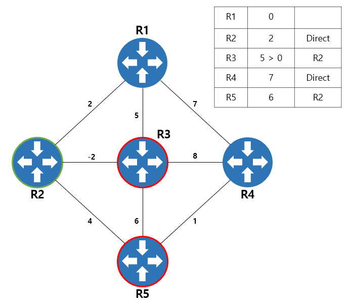 R1의 인접 노드를 모두 확인했으니, 링크가 연결된 다른 인접노드로 넘어가서 탐색을 시작합니다. 순서는 무관하지만 우선 R2로 넘어가보겠습니다. R3로 가는 경로의 값이 5 > 2+(-2) 이므로 최단경로를 갱신하고, R5로 향하는 경로값(2+4)을 갱신합니다. 다음으로는 R3로 넘어가서 인접노드를 탐색하고, 다음으로는 R4로 넘어가서 인접노드를 탐색하게 됩니다.