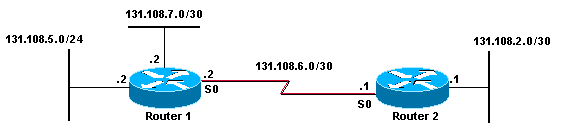 위 구성에서, Router1 은 131.108.5.0/24 네트워크에서 받은 RIPv1 라우팅 업데이트를 서브넷마스크가 다른 131.108.7.0/30 네트워크나 Router 2 방향으로 광고하지 않습니다. 반면 131.108.7.0/30 과 131.108.6.0/30 또는 131.108.2.0/30 네트워크로는 서브넷마스크가 같으므로 광고하고, 정상적인 라우팅 테이블 갱신이 이뤄지게 됩니다.