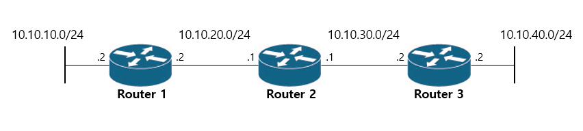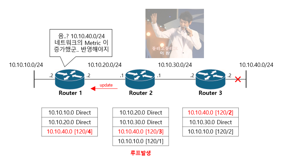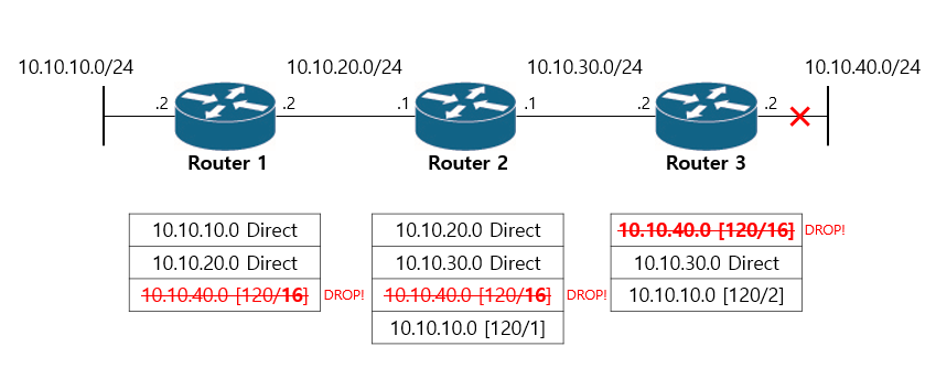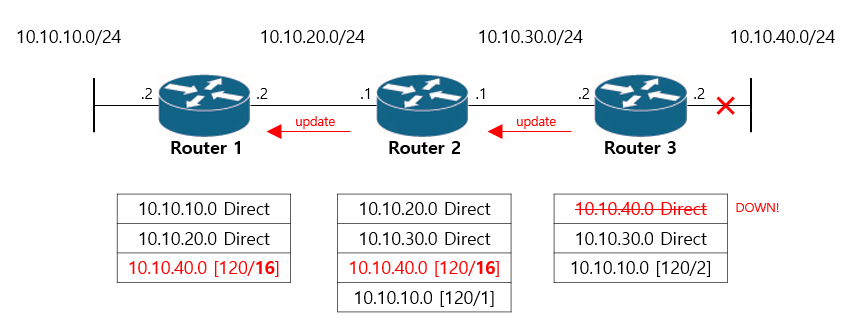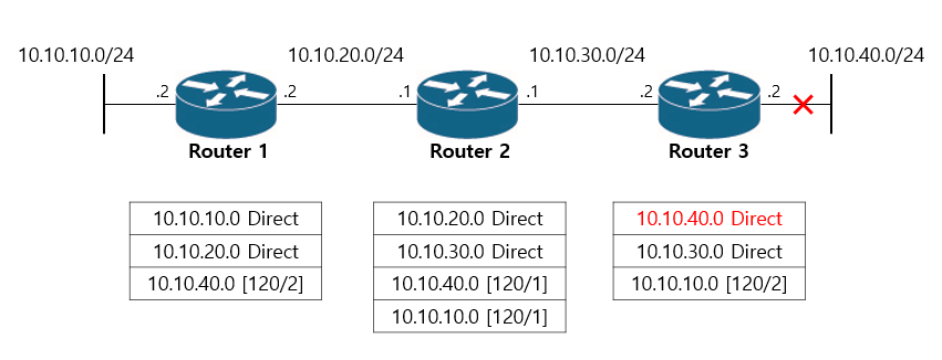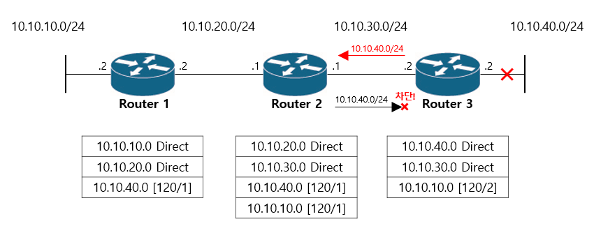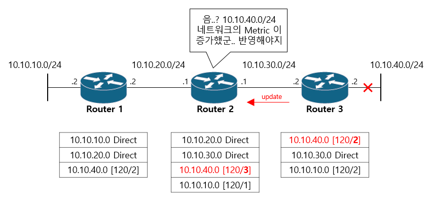 위 구성에서, 10.10.40.0/24 네트워크에 문제가 생겨 Router 3 의 테이블이 Drop 되었을 경우를 보겠습니다. RIP는 30초마다 업데이트를 수행하는데, Router 3 가 이 정보를 전파하기 전에 Router 2 에서 업데이트가 수행된다면 어떻게 될까요?