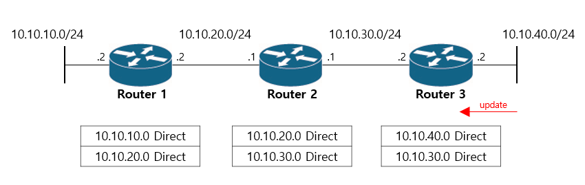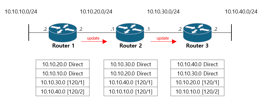 기본적으로 RIP는 30초마다 업데이트를 수행합니다. 업데이트 수행 방향이 존재하지는 않지만, 이해를 돕기위해 10.10.40.0/24 부터 업데이트된다고 가정하겠습니다.