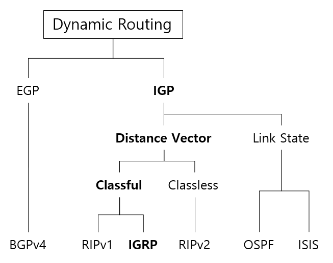 - Interior Gateway Protocol - AS 내부에서 동작하는 라우팅 프로토콜.