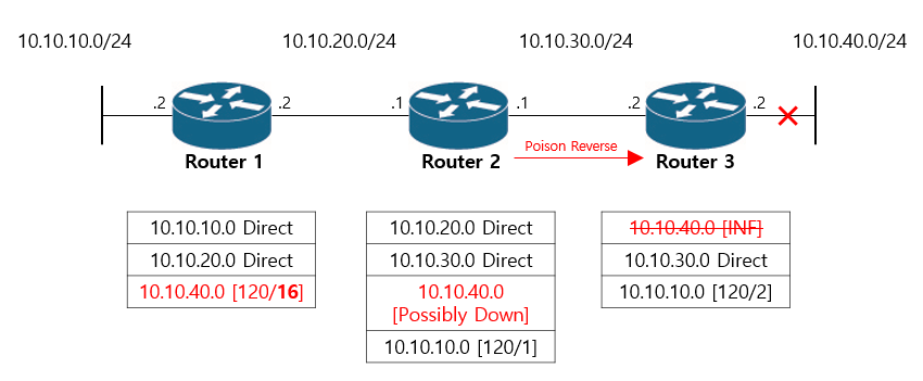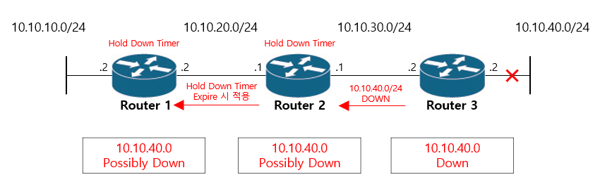 Router 3 은 10.10.40.0/24 네트워크가 다운되었다는 사실을 Router 2 에게 전파합니다. 이 때, Router 2 는 Invalid Timer 를 시작하여 180초를 대기하며 이 시간동안 가진 경로의 Metric 보다 더 나은 경로의 정보를 받을 시 라우팅 정보를 갱신하고 Hold Down Timer를 해제합니다.