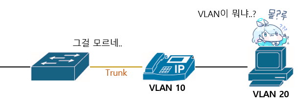 이러한 구성은 현재에도 실제로 많이 접하는 구성입니다. 여기서 IPT는 VLAN의 개념을 이해하지만, PC는 Tagging 프레임을 이해하지 못하죠. 그렇다고 IPT가 Untagging을 수행하는 기능이 존재하는 것도 아닙니다. 이러한 구성에 대한 내용은 추후에 Voice VLAN을 추가적으로 다루면서 더 자세히 설명드리겠지만, 아무튼간에 이런 경우에는 Native VLAN을 구성해야합니다.